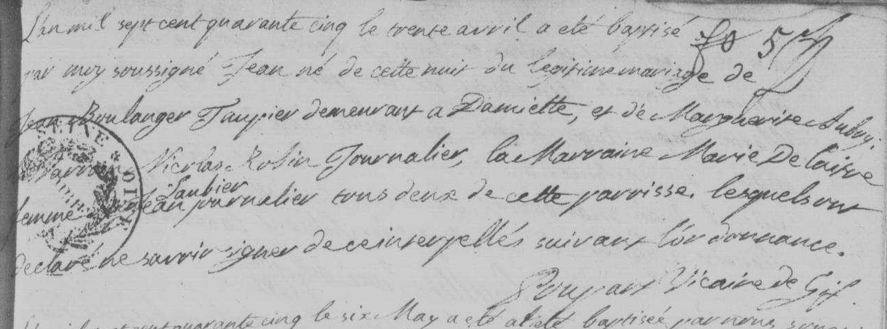 - Jean Boulanger, né 30 avril 1745 à Gif-sur-Yvette, était le fils d'autre Jean Boulanger et de Marguerite Aubry, taupier à Damiette, alors petit hameau de Gif-sur-Yvette.