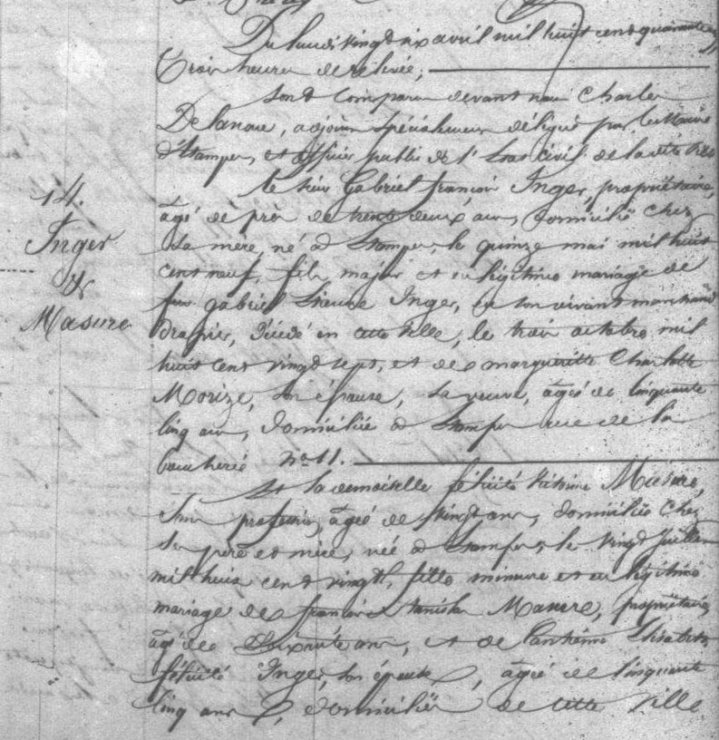 - Félicité-Victorine Masure (1820-1888), mariée à Étampes le 26 avril 1841 avec Gabriel-François Inger (1809-?).