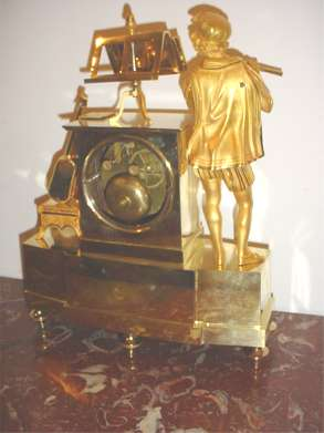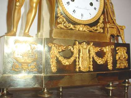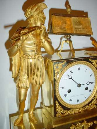 | An Excellent Gilt Bronze Clock, made in France around 1810, the Empire Period. Very fine detailed with several fine and heavy gilt bronze ornaments. Historical fashioned Troubadour playing his flute, banded lute on a bench, music stand with sheet on top. Lyre with guirlands and double horns of plenty on lower case. It all stands on 7 turnable and ciselated feet. All gilt parts in really excellent condition, all over original. Enamelled dial in good condition (tiny chip at left keyhole and tiny haircrack at XII), with Roman numerals, fine steel hands and pendulum adjust. Signature “Masure à Etampes”. Early French clockwork with pendulum hanging on silk, 8 day movement, 1/1 and 1/2 hours striking on a silvered bell. Properly running and striking. Measurements : base case 12” x 3.5”, total height 15”, dial diam. 3.5”. Overall very good condition. (…) The clocks I’m selling come from an important clocks collection in The Netherlands. | Superbe horloge de bronze doré, fabriquée en France vers 1810, sous l’Empire. Décoration très joliment détaillée avec plusieurs beaux éléments décoratifs de bronze massif doré. Troubadour en costume d’époque jouant de la flûte affronté à un luth sur un banc, et pupitre avec partition sur le sommet de l’horloge. Lyre dans une guirlande et cors doubles sur la plus grande partie de la base du boîtier. Le tout repose sur sept pieds tournant et ciselés. Cadran émaillé […] avec des chiffres romains, belles aiguilles d’acier et pendule bien réglé. Signature: «Masure à Étampes». Horloge ancienne française avec pendule pendant sur soie, mouvement de huit jours, sonnerie toutes les heures et demi-heures sur une sonnette argentée. La base du boîtier mesure 30, cm sur 9. La hauteur totale de l’horloge est de 38 cm et le diamètre de son cadran mesure 9 cm. (…) Provient d’un importante collection néerlandaise. |