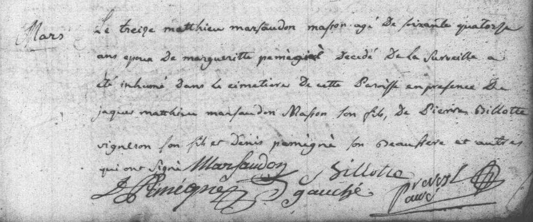 - Jacques-Matthieu Marsaudon, né à Écharcon le 21 août 1759, était le fils de Marie-Marguerite Pémigné/Pémignier et du maçon Matthieu Marsaudon, tous deux mariés à Écharcon le 22 novembre 1745.