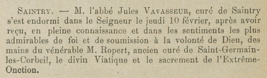 - Oraison funèbre du curé de Saintry, Vavasseur, en 1853 — Semaine religieuse de Versailles 20/1021 (27 février 1898) 472-472.