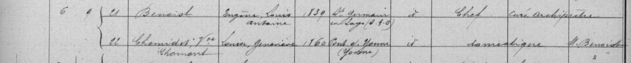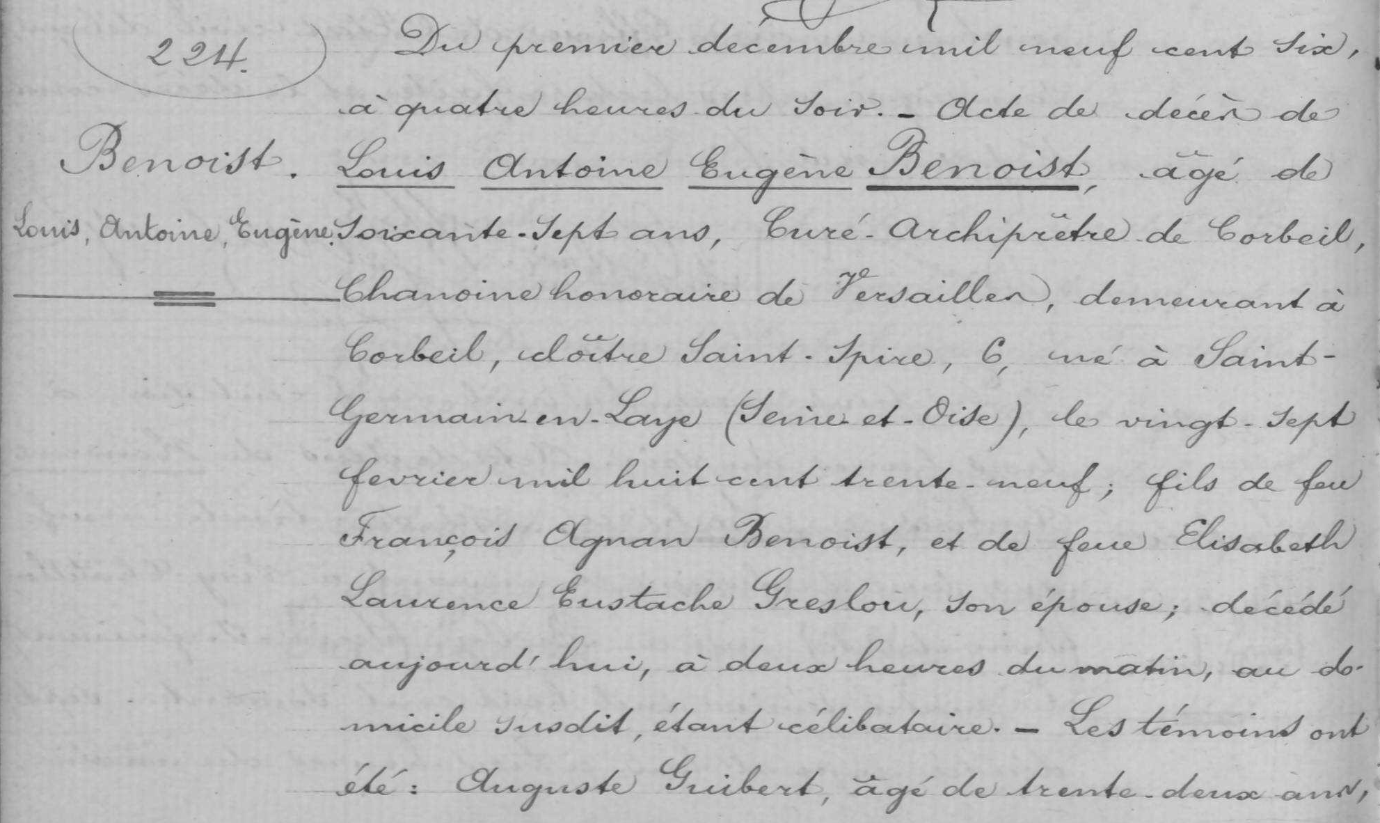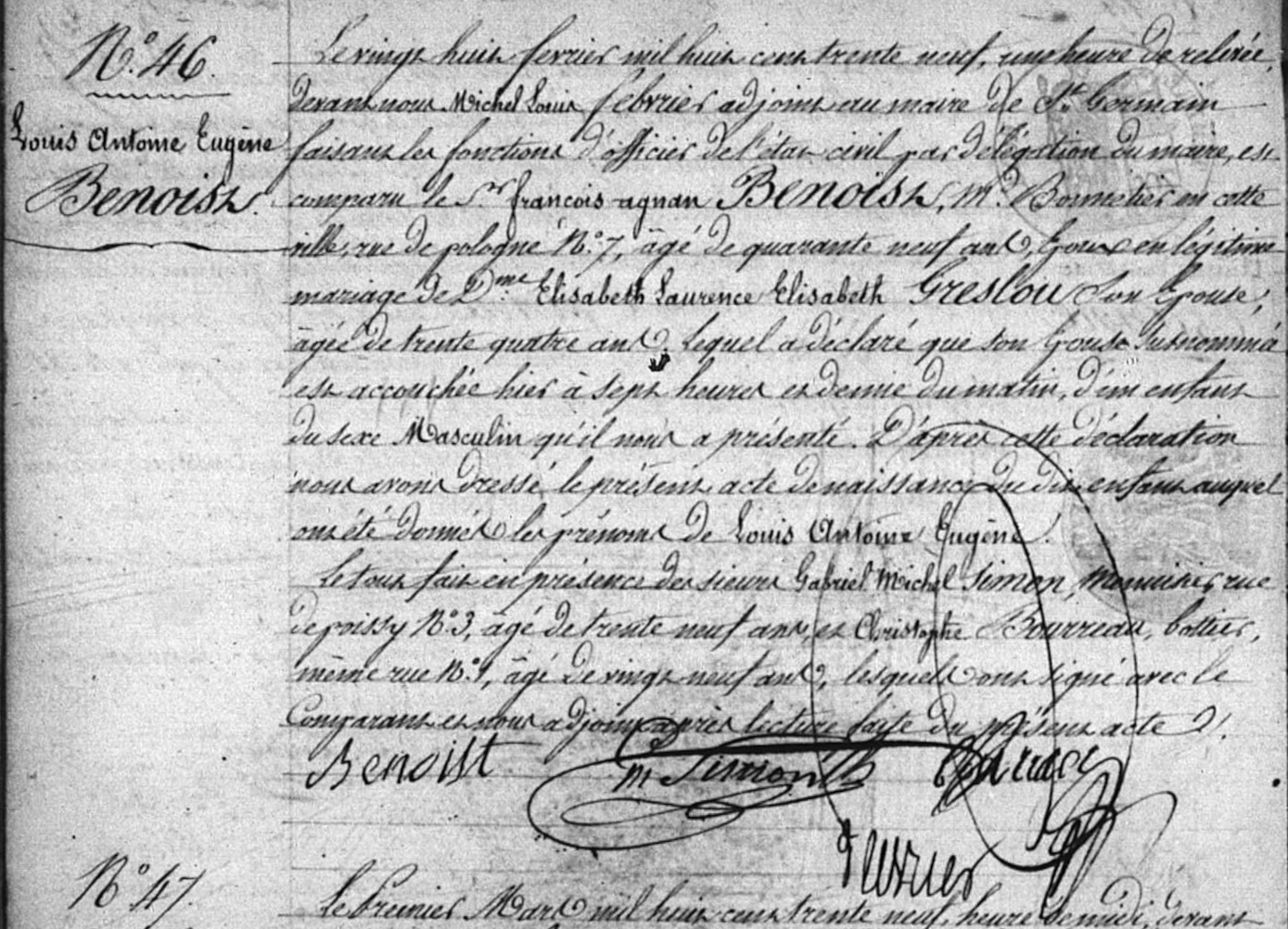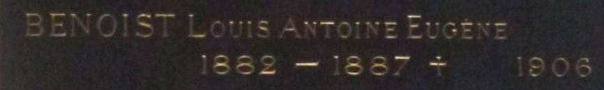 - Louis-Antoine-Eugène Benoist, né le 27 février 1839 à Saint-Germain-en-Laye (Yvelines), était le fils d'Élisabeth-Laurence-Élisabeth Greslou et du bonnetier François Agnan Benoist.