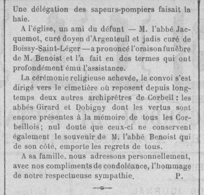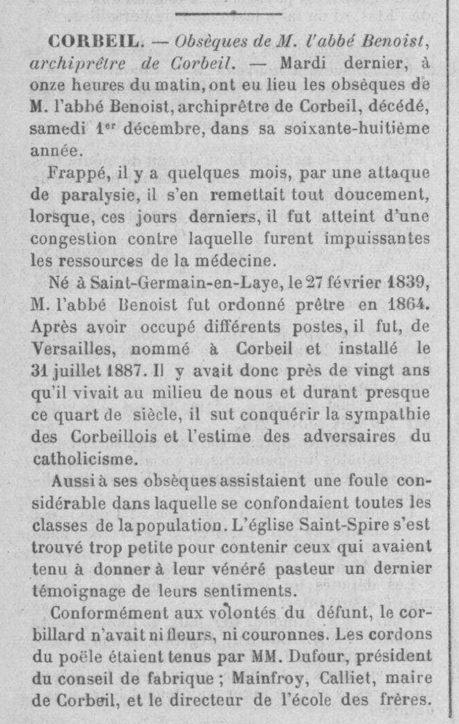 - P., “Obsèques de M. l'abbé Benoist, archiprêtre de Corbeil”, L'Abeille de Seine-et-Oise 96/95 (6 décembre 1906) 2.