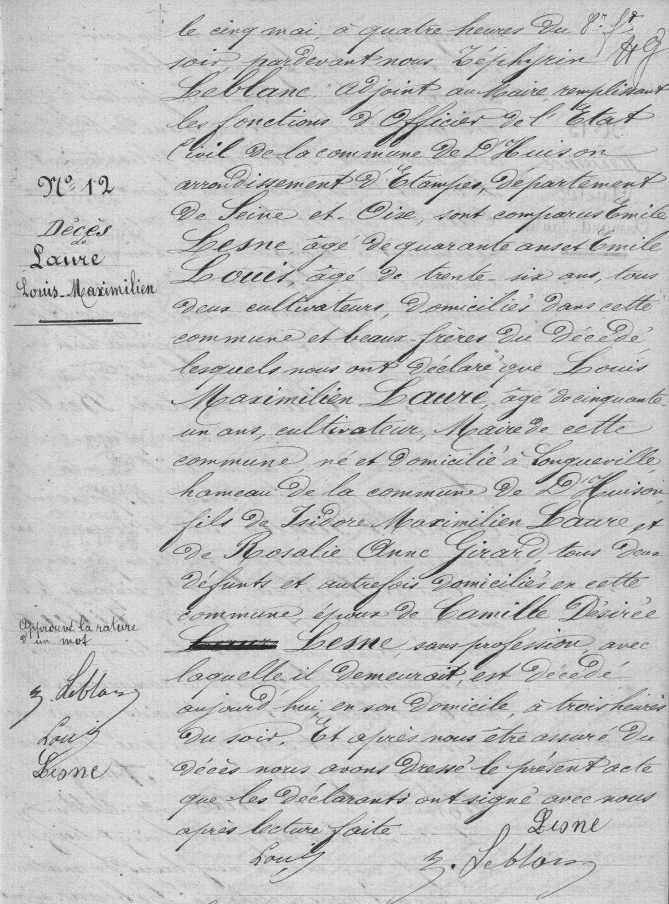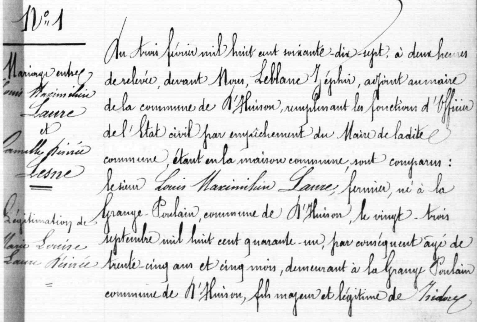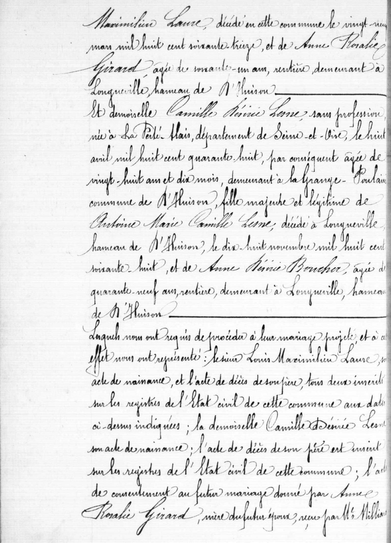 - Louis Maximilien Laure, né 23 septembre 1841 à la Grange-Poulain, commune de D'Huison-Longueville, était le fils de Rosalie-Anne Girard (1815-1888) et d'Isidore-Maximilien Laure (1810-1873).