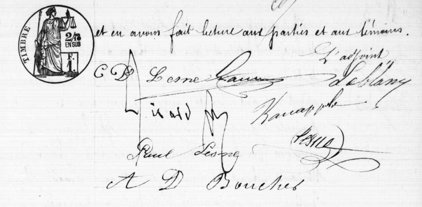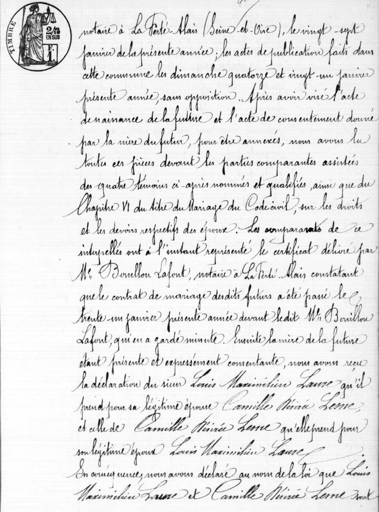 - Contrat de mariage passé à La Ferté-Alais devant Me Bouilloux-Lafont le 31 janvier 1877.