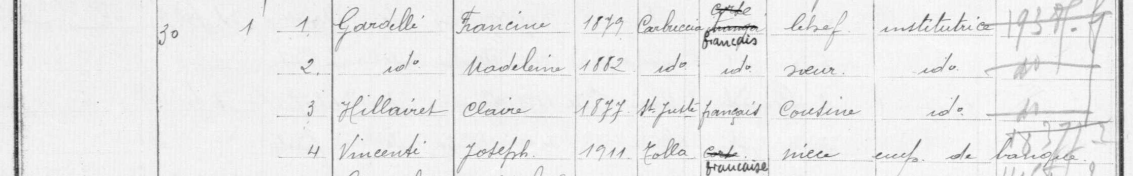 - Marie-Françoise Gardelli (1882-1967), dite Francine Gardelli, née le 6 mai 1879 à Carbuccia (Corse du Sud), était la fille de Sylvestre Gardelli (né en 1842) et de Marie-Joséphine Carbuccia (1852-1887).
