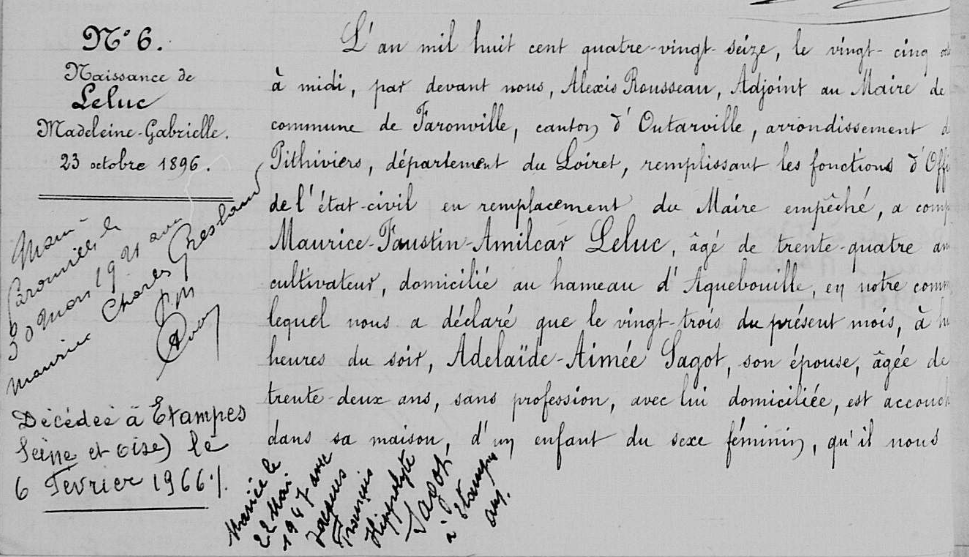 - Hélène-Agathe-Julie Leluc (1858-1951), mariée le 22 juin 1881 à Bazoches-les-Gallerandes (Loiret) avec Auguste-Eugène-Adrien Lasne (1856-?)