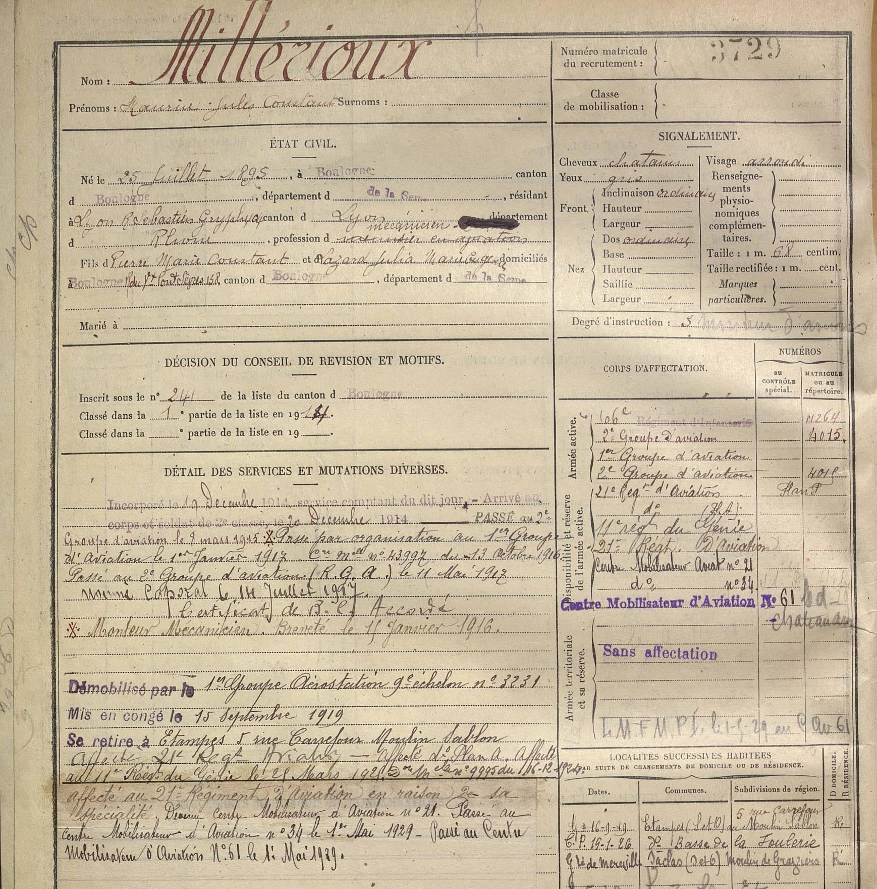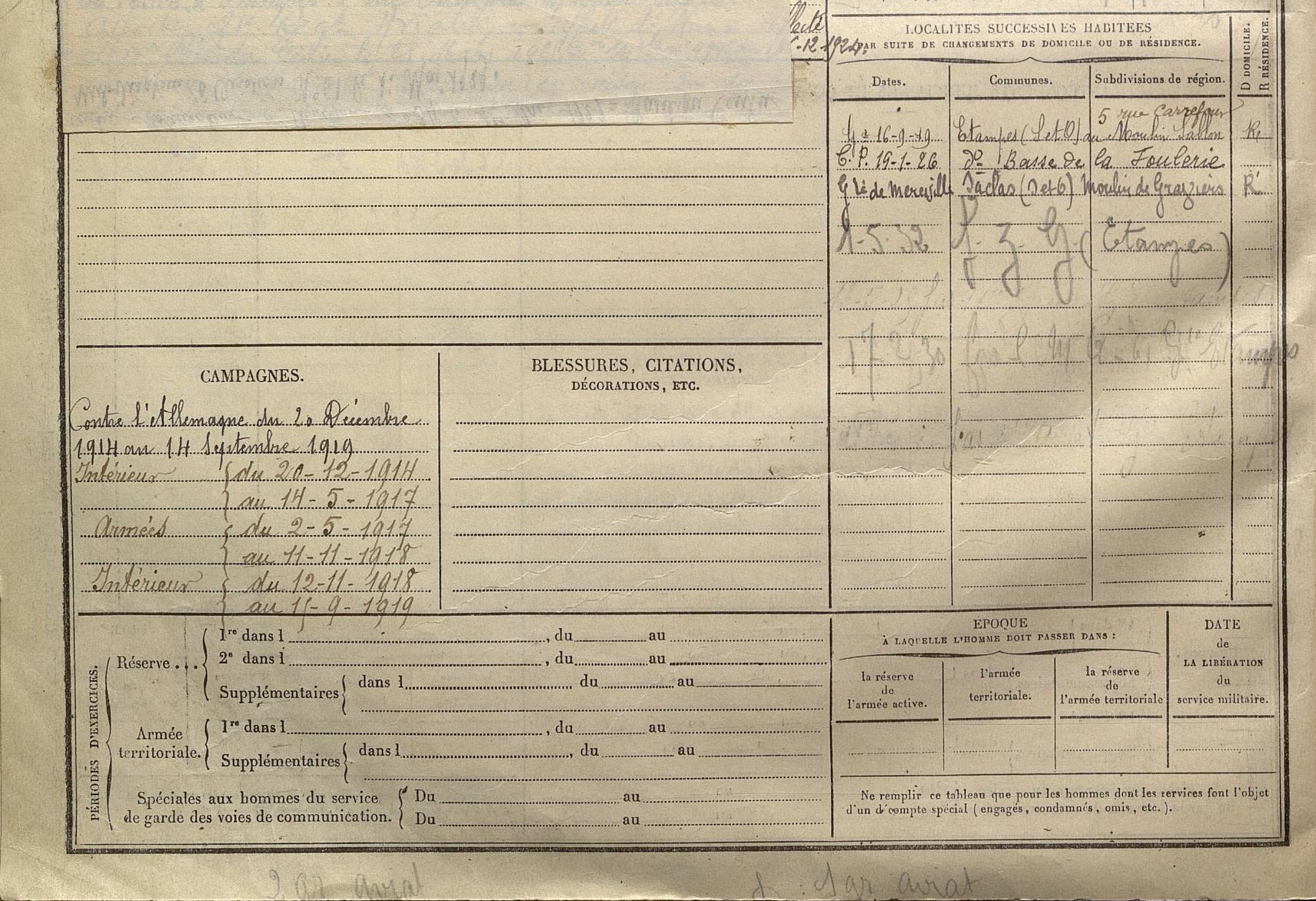 - Mis en congé le 15 septembre 1919, se retire à Étampes 5 carrefour du Moulin Sablon