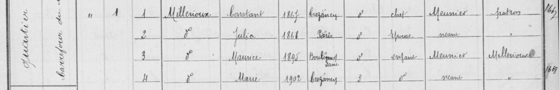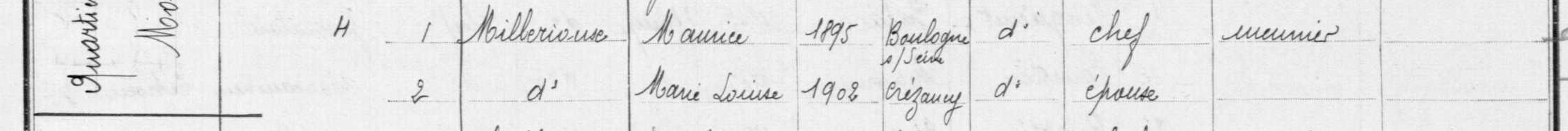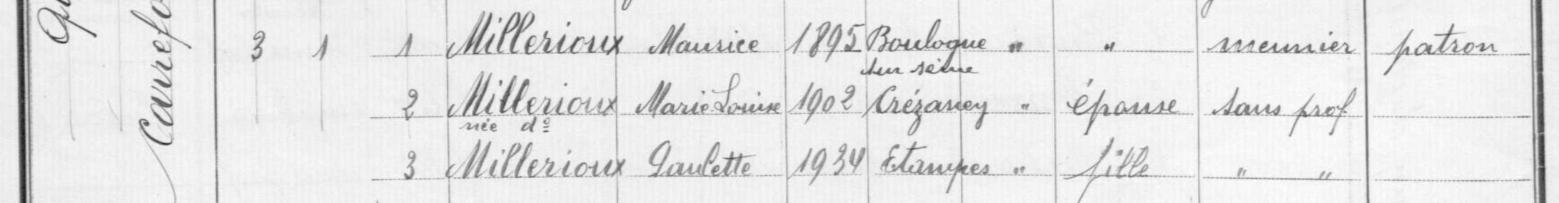 - Maurice-Jules-Constant Millérioux, né à Boulogne (Seine) en 1895, était le fils de Marie-Justine-Adélaïde Millérioux et de Pierre-Marie-Constant Millérioux, d'abord menuisier à Boulogne puis meunier à Étampes au moulin Sablon.