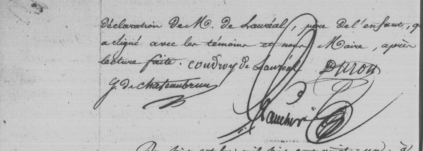 - Oncle et beau-père d'Édouard Coudroy de Lauréal, Nicolas David Henri (alias Rémy) de Coudroy de Lauréal, né au Moule le 23 octobre 1773, est décédé à Limours (Essonne) dont il fut maire. Il avait épousé vers 1800 Louise Anne (dite Nancy) de La Peyrouse. Il séjourna à Newport (Rhode Island, États-Unis d'Amérique) où naquirent au moins deux de ses filles, Marie-Madeleine comme vu supra, et Anne Françoise Adélaïde. Demoiselle Anne Françoise Adélaïde de Lauréal, 19 ans, née à Newport, État de Rhode Island, en Amérique septentrionale le 13 septembre 1806, demeurant chez ses parents, fille de M. David Coudroy de Lauréal, chevalier de Saint-Louis, maire de cette ville, et de dame Anne-Louise Lapeyrouse, épouse à Limours le 31 janvier 1826 M. Claude Adolphe Montanier de Belmont, propriétaire, 26 ans, né à Lissy, Seine-et-Marne, le 14 août 1799 (27 thermidor an VII), déclaré le lendemain (État civil de Lissy), demeurant à Paris, rue Saint-Joseph, fils de M. Antoine Montanier de Belmont, ancien capitaine d'infanterie, demeurant à Paris, rue des Grès, n°10, et de feue dame Élisabeth Madeleine Pageaut, en présence d'Edme Jean Blaque, 72 ans, avocat à la Cour royale, demeurant à Paris, rue de Saintonge, ami de l'époux, de Jean Bernard Pageaut de Lissy, 68 ans, contrôleur général honoraire des finances de monseigneur le comte d'Artois, aujourd'hui Charles X, ancien président de l'ordre des avocats aux |1934| Conseils du Roi et en la Cour de cassation, demeurant à Paris, 13, rue de Saintonge, oncle de l'époux, de Jules Louis Charles Bruny de Chateaubrun, 38 ans, sous-chef au ministère des finances, demeurant à Paris, 20, rue Dauphine, cousin de l'épouse, et d'Évremond Coudroy de Lauréal, 42 ans, propriétaire, demeurant à Paris, rue des Vieux-Augustins, n°21. Nicolas David Coudroy et Anne Louise de La Peyrouse eurent encore des enfants à Limours : Rémi Jules Léon Coudroy de Lauréal né à Limours le 30 septembre 1821, déclaré le lendemain, décédé le 19 octobre suivant, fils de Rémi Nicolas David Coudroy de Lauréal, propriétaire, et de madame Anne Louise de La Peyrouse, et Louise Marie Madeleine Léontine, née le 9 août 1831, fille de M. Rémy David Coudroy de Lauréal, propriétaire, chevalier de Saint-Louis, 58 ans, et de dame Anne Louise de La Peyrouse, 44 ans. À Limours le 8 novembre 1839 est déclaré le décès de David Henri Coudroy de Lauréal, chevalier de Saint-Louis, ancien officier de marine, 67 ans, époux de dame Louise Anne de La Peyrouse, fils de Léon Coudroy de Lauréal et de dame Marie-Madeleine Brunie (sic) de Chateaubrun, les témoins étant son fils Jean-Baptiste Coudroy de Lauréal, 35 ans, propriétaire à la Guadeloupe, canton du Moule, et Léon de Wavrechin, son neveu, ecclésiastique, 35 ans.