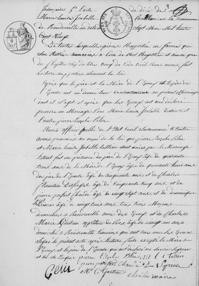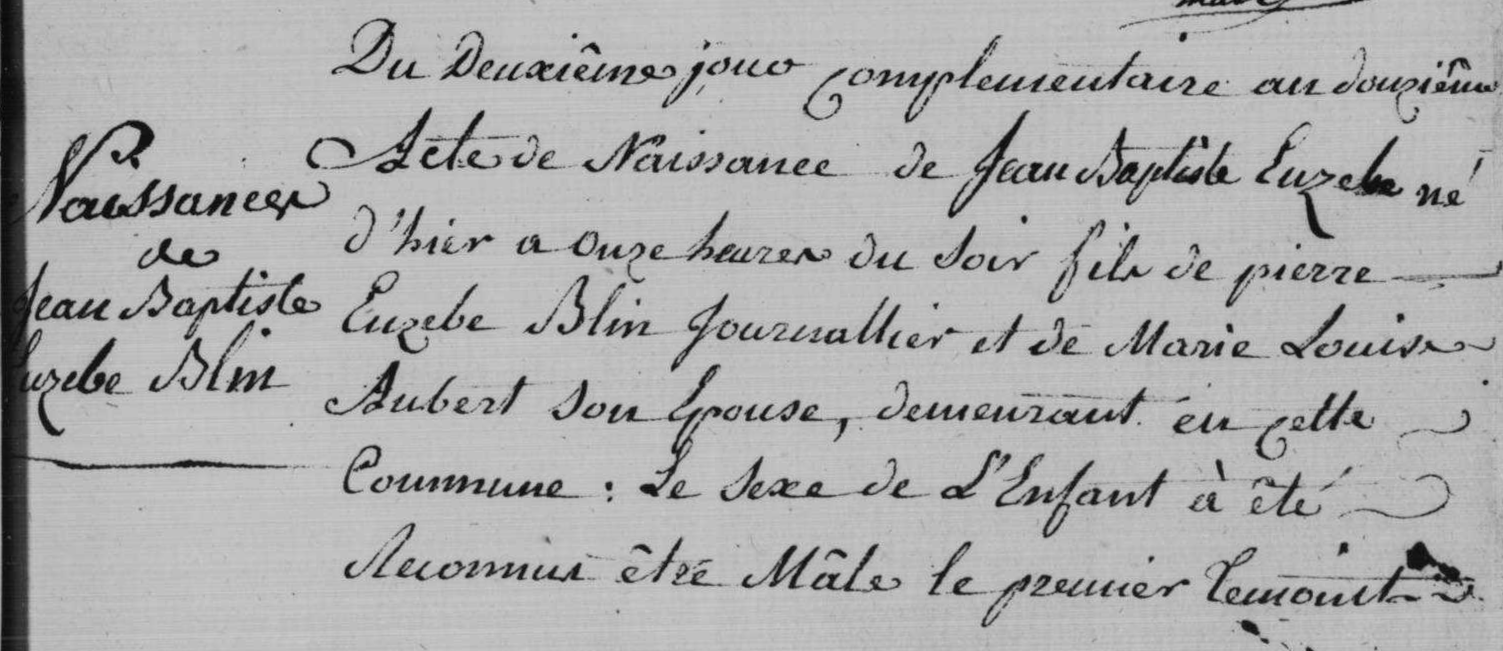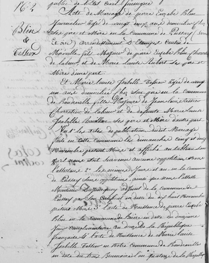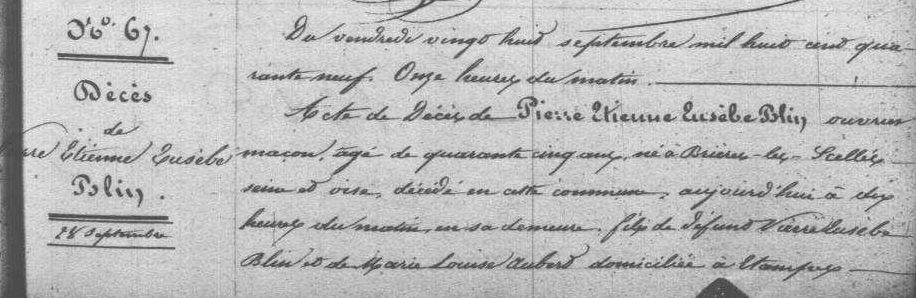 - Pierre-Étienne-Eusèbe Blin (comme il est constamment appelé bien que son acte de naissance porte tout différemment “Jean-Baptiste-Eusèbe Blin”, et qu'il signe lui-même lors de son mariage “Pierre Euzèbe Blin”), né à Brières-les-Scellés le 2e jour complémentaire de l'an 12 (19 septembre 1804), était le fils de Marie-Louise Aubert (1780-?) et de Pierre-Eusèbe Blin (1783-av.1849).