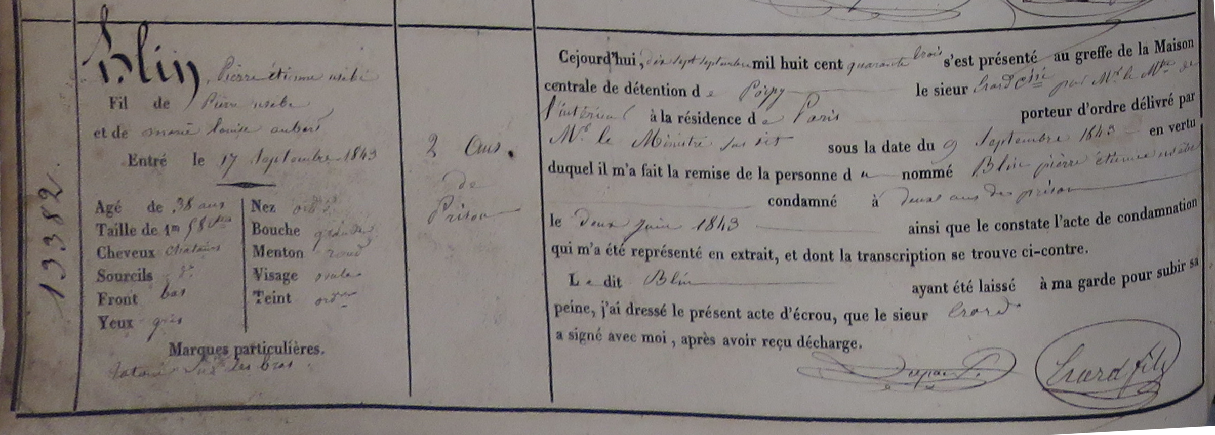 - AD78 2Y1/90 n°13382 — Registre d'écrou de la prison de Poissy (1843-1845).