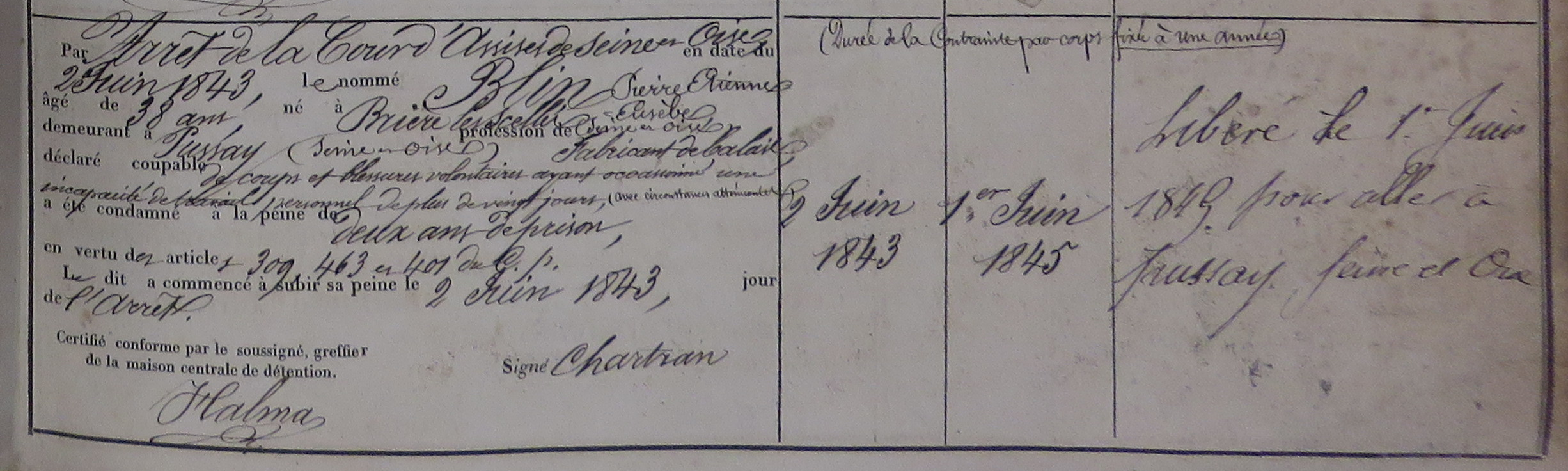 - Incarcération à la prison de Poissy (Yvelines) du 17 septembre 1843 au 1er juin 1845 pour “coups et blessures ayant occasionné une incapacité de travail personnel de plus de vingt jours”.