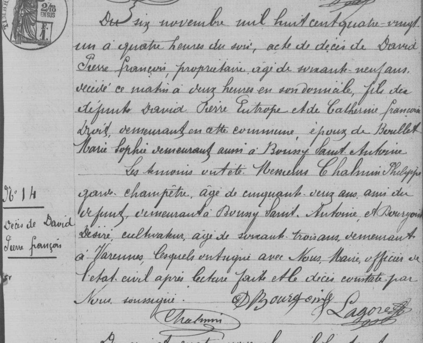 - Louis-François-Désiré David (1842-1878) marié le 17 novembre 1868 à Varennes-Jarcy Désirée-Alexandrine Bourgoin (1845-1878).