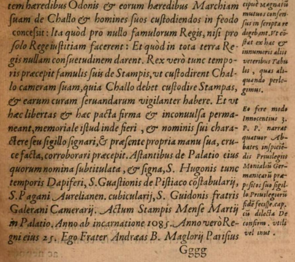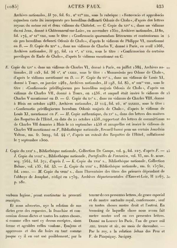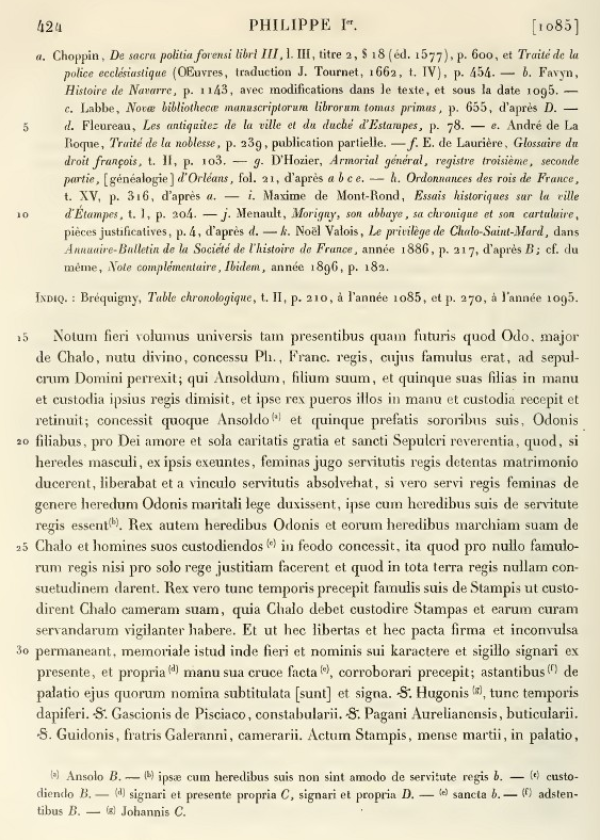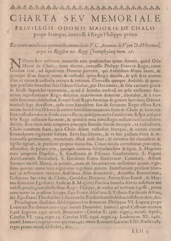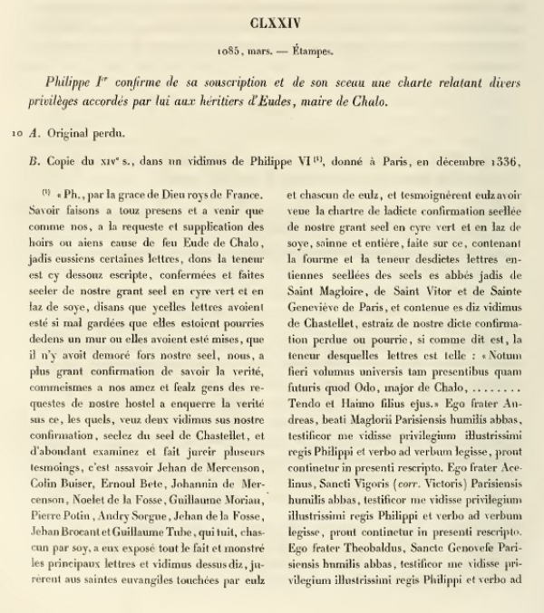 - Charles d'Hozier (1640-1732), Armorial général, registre troisième, seconde partie, [généalogie] d'Orléans, fol. 21. * Cette édition suit les textes de Choppin 1577, Favyn 1612, Labbé 1657 et La Roque 1678. * Emmanuel de Pastoret (1755-1840) [éd.], Ordonnances des rois de France de la troisième race. Quinzième volume, Contenant les ordonnances rendues depuis le commencement du règne de Louix XI, jusqu'au mois de juin 1463, par M. le comte de Pastoret [LXXXI+891 p.], Paris, Imprimerie impériale, 1811, p. 316. * Cette édition suit le texte de Choppin 1577. * Maxime de Montrond, “NOTE VI. Sur la franchise de Challo Saint-Mard. (Chap. VI, p. 76 et 79.)” (avec une édition de la charte latine de 1085 différente de celle de Fleureau), in Id., Essais historiques sur la ville d'Étampes. Tome 1, Etampes, Fortin / Paris, Debécourt, 1836, pp. 203-207. * Cette édition ne précise pas sa source, et paraît éclectique; elle est moins bonne que celle de Fleureau. * Ernest Menault (1825-1903), Essais historiques sur les villages de la Beauce. Morigny (village monacal), son abbaye, sa chronique et son cartulaire, suivis de l’histoire du Doyenné d'Étampes (in-8°, 212+209 p., éditions princeps du Cartulaire et de l'Histoire du doyenné, ouvrage couronné par l'Institut), Paris, A. Aubry, 1867, 2e partie, p. 4 * Simple reprise du texte de Fleureau. * François Rageau, Glossaire du droit françois [2 volumes grands in-4°], Paris, 1704. * Eusèbe-Jacques de Laurière (1659-1728) [réviseur et continuateur] [éd.], François Ragueau [premier auteur], Glossaire du droit françois. Nouvelle édition, publiée par L. Faure, Niort, L. Favre, 1723, tome II, p. 103. * Léopold Favre (1817-1890) [éditeur], Eusèbe-Jacques de Laurière (1659-1728) [réviseur et continuateur], François Ragueau (†1605) [premier auteur], Glossaire du droit françois contenant l'explication des mots difficiles qui se trouvent dans les ordonnances des roys de France, dans les coustumes du royaume, dans les anciens arrests et les anciens titres par François Ragueau,… revu, corrigé, augmenté revu, corrigé, augmenté de mots et de notes, et remis dans un meilleur ordre par Eusèbe de Laurière. Nouvelle édition avec additions d'anciens mots, précédée d'un Essai sur les origines du droit français (par Amédée Trouillard) et suivie du Glossaire du Code féodal, publiée par L. Favre (in-4°, LII+515+30 p., réunit: Essai sur les origines du droit français; Glossaire ou Explication des mots difficiles qui se trouvent dans les coutumes de France; Glossaire du droit féodal; Recueil chronologique des décrets concernant les droits féodaux; notice bibliographique sur les matières féodales p. 25; index), Niort, L. Favre, 1882.
