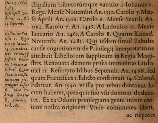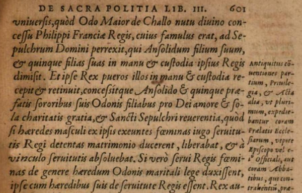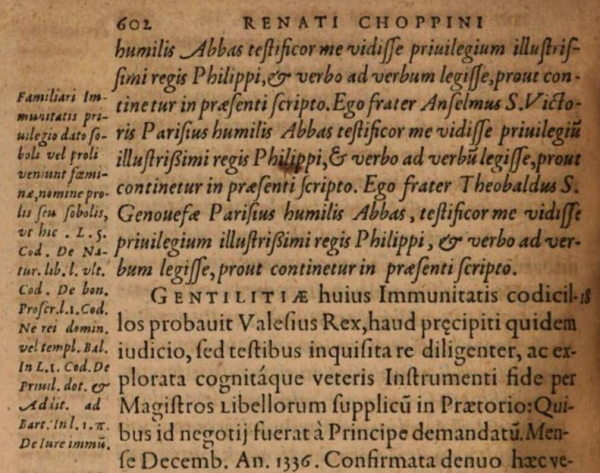 - Renati Choppini Andegavi juris consulti et in regio Parisiensi senatu causarum patroni De Sacra politia forensi libri III ad Henricum III Galliarum et Poloniae regem, cum indice verborum rerumque locupletissimo, Paris, Nicolas Chesneau, 1577, p. 600.