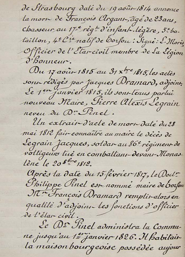 - P. 33: “Pinel, en 1802, avait acheté une campagne entre Étampes et Arpajon; il l'avait payée, dit-il dans une de ses lettres, 6O.000 francs comptant; il allait tous les samedis, jusqu'au lundi, se reposer à Torfou des fatigues de la semaine, ou plutôt pour s'y livrer à l'étude avec plus de liberté; il avait là une seconde bibliothèque bien choisie. C'est dans cette maison de campagne simple, mais bien située et très agréable, qu'il recevait ses amis et ses disciples. Maire de Torfou depuis longtemps, il accueillait avec plaisir les hommages qu'on s'empressait de lui rendre à certaines époques, et principalement lors de la fête du lieu. Les pauvres des environs avaient en lui un bienfaiteur dont les conseils ne leur manquaient jamais.”