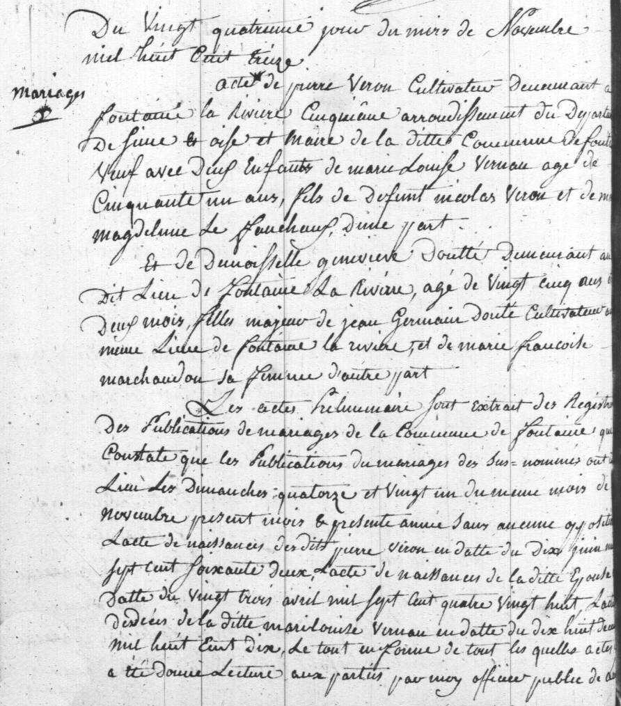 - Il se maria en premières noces le 10 mai 1791 à Fontaine-la-Rivière avec Marie-Louise Verneau (1762-1810), fille de Marguerite Chenu et de François Verneau