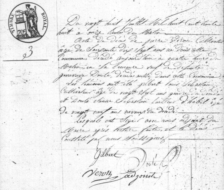 - Marie-Claire Véron (1797-1866), journalière, mariée à Fontaine-la-Rivière le 10 juin 1813 avec François Véron (v.1790-?)