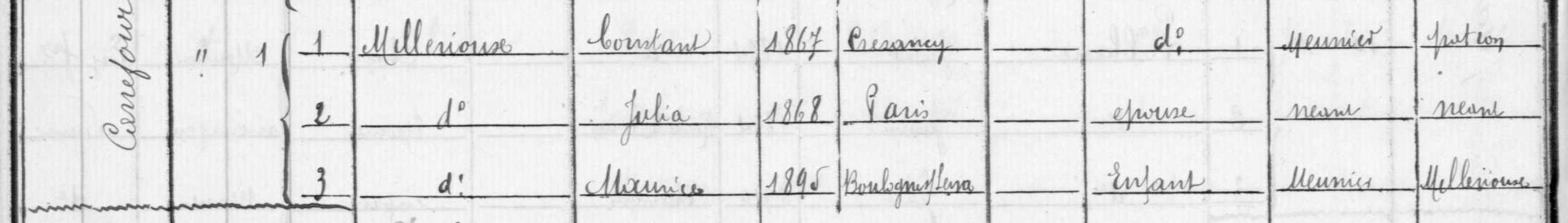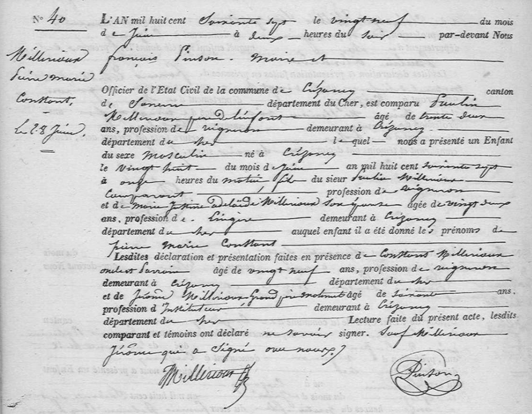 - Pierre-Marie-Constant Millérioux, dont le prénom d'usage était Constant, né à Crézancy (Cher) le 28 juin 1867, était le fils de Marie-Justine-Adélaïde Millérioux et de Paulin Millérioux, tous deux vignerons à Crézancy (Cher).