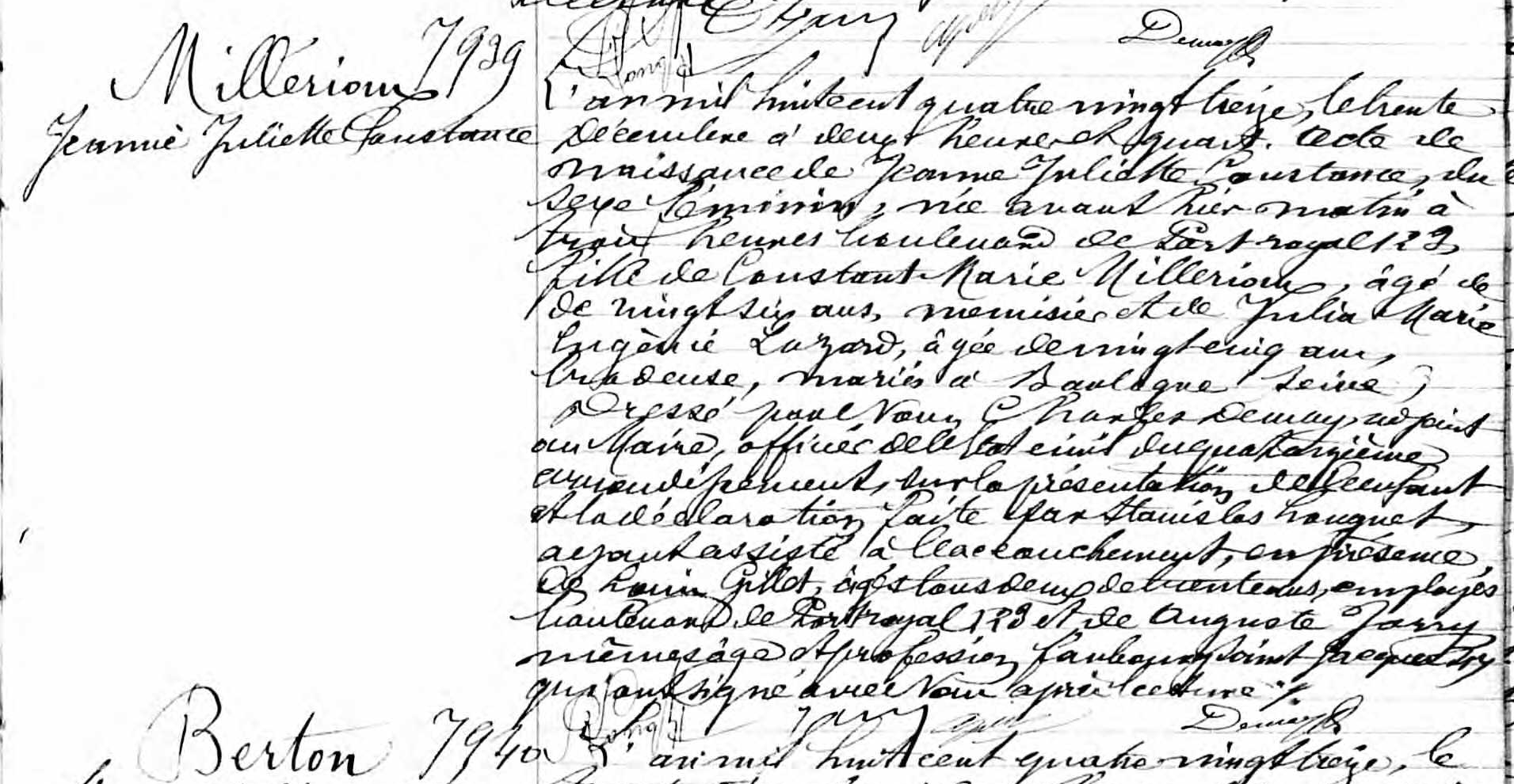 - De cette union naquirent au moins:- 1° Jeanne-Juliette-Constance Millérioux (1893-?)