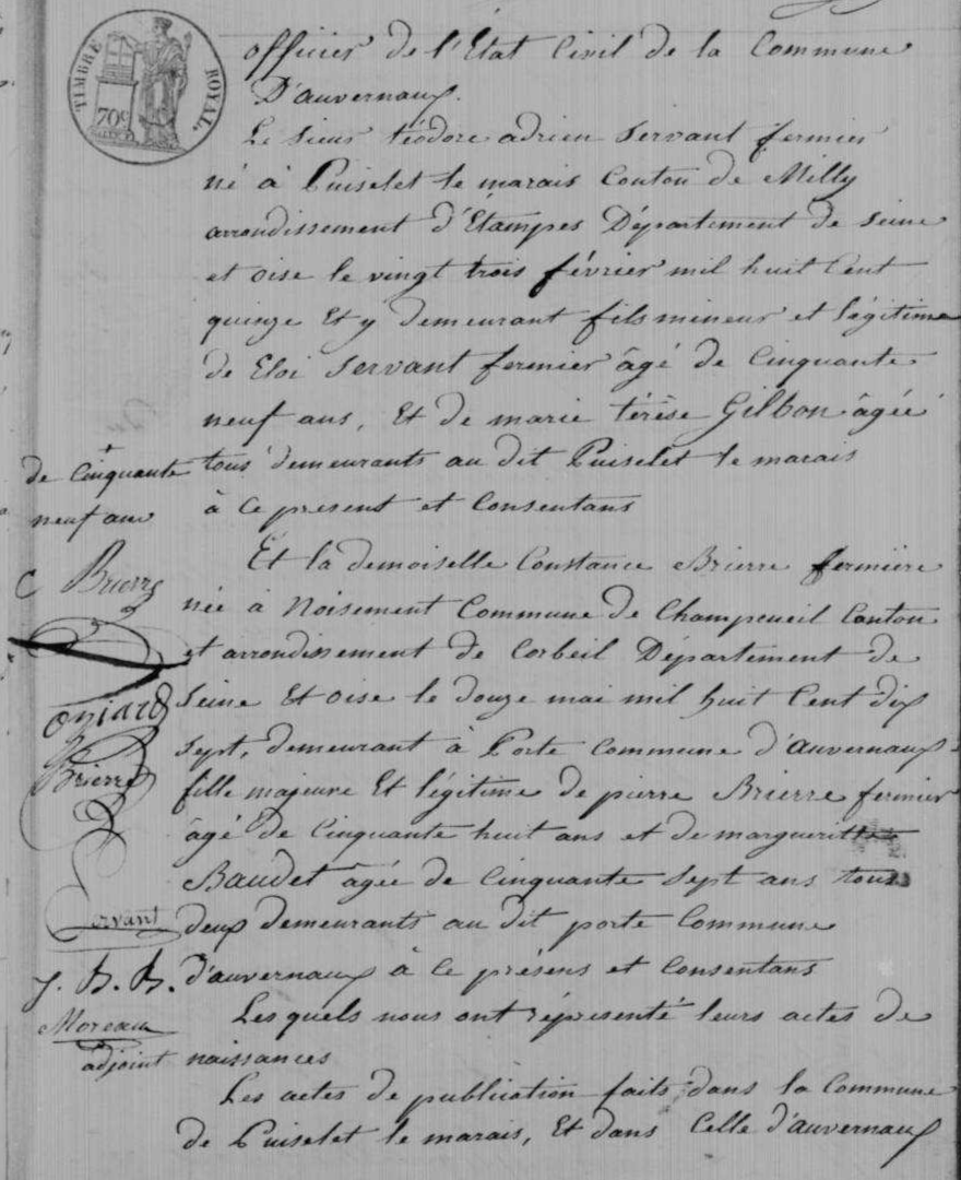 - Il se maria à Auvernaux le 4 juin 1839 avec Constance Brierre (1817-1859), née le 12 mai 1817 à Champcueil, morte le 30 juillet 1859 à Puiselet-le-Marais.