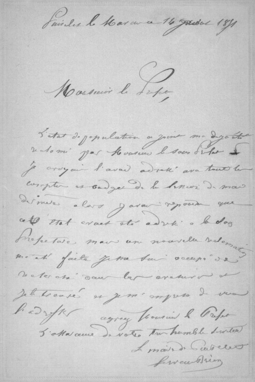 - Courrier au Préfet en 1851 — Joint au recensement, AD91 6M/241.