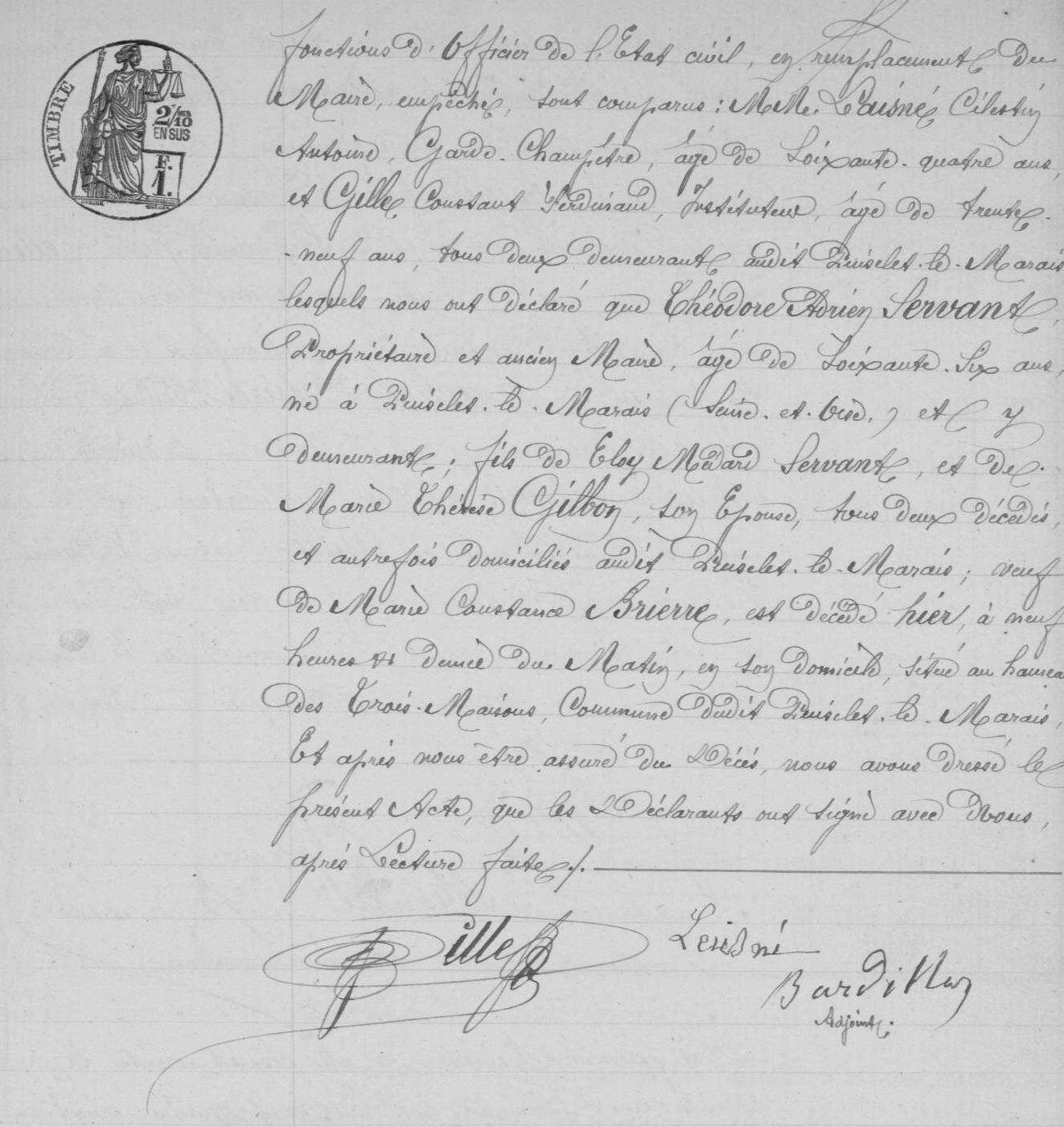 - Il mourut le 14 juillet 1881 au hameau des Trois Maisons, commune de Puiselet-le-Marais, âgé de 66 ans.