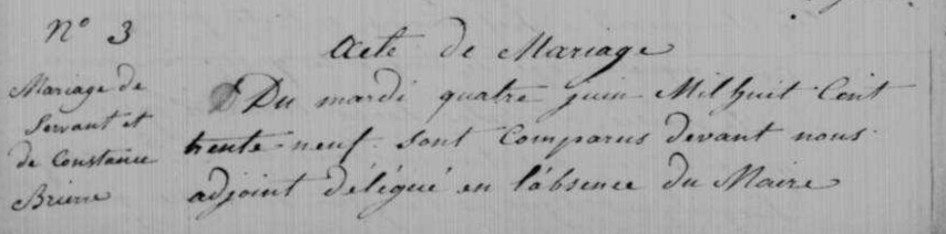 - Il se maria à Auvernaux le 4 juin 1839 avec Constance Brierre (1817-1859), née le 12 mai 1817 à Champcueil, morte le 30 juillet 1859 à Puiselet-le-Marais.- De cette union naquit:- Adrien-Constant Servant (1841-1901), marié le 10 novembre 1863 à Milly-la-Forêt avec Clarisse-Victorine Guyon et père de six enfants nés de 1865 à 1880.