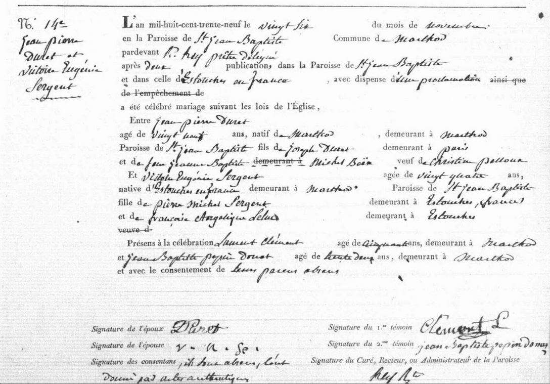 - Elle se maria à Marthod (Savoie) le 26 novembre 1839 avec Jean-Pierre Duret (1810-1869), veuf de Christine Pelloux.
