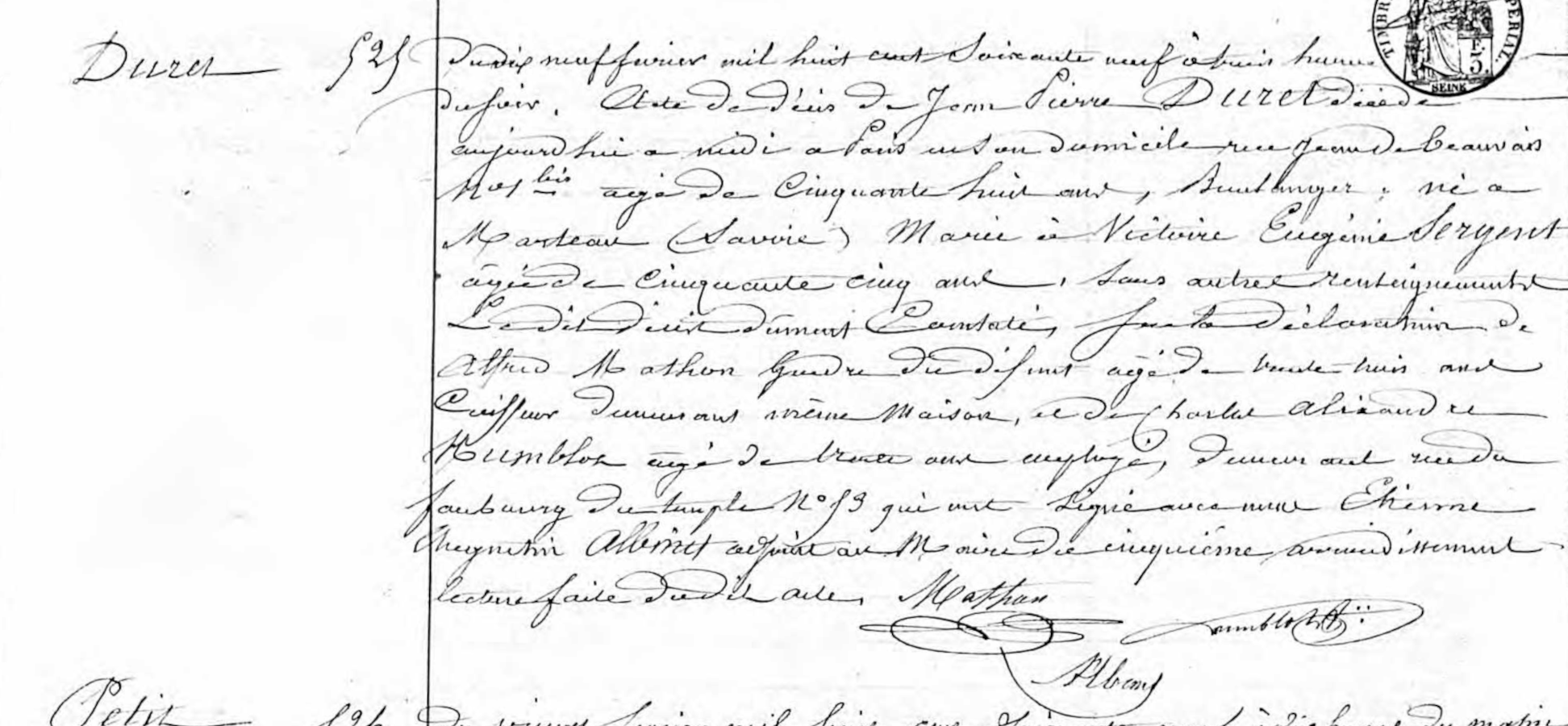 - 4° Monsieur Charles-Joseph-Désiré DURET, commissionnaire, demeurant à Paris, rue Rambuteau, numéro 56;