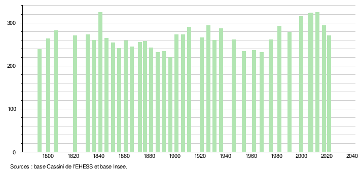 Sur la base de données empruntées, pour les années 1793-1999, au site du Laboratoire de Démographie et d'Histoire Sociale de l'EHESS, École des hautes études en sciences sociales; et, pour les années 2006 à 2021, au site de l'INSEE, Institut national de la statistique et des études économiques.