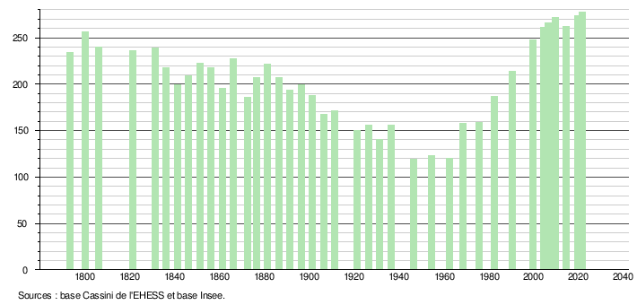 Sur la base de données empruntées, pour les années 1793-1999, au site du Laboratoire de Démographie et d'Histoire Sociale de l'EHESS, École des hautes études en sciences sociales; et, pour les années 2006 à 2021, au site de l'INSEE, Institut national de la statistique et des études économiques.