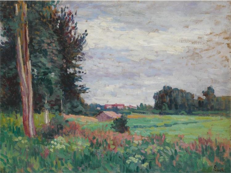 Maximilien LUCE (1858-1941) Paysage au crépuscule… Maximilien LUCE (1858-1941) Paysage au crépuscule à l’étang de Moulineux, 1910 Huile sur toile. Signée et datée en bas à gauche. (Petite restauration). 65 x 92 cm