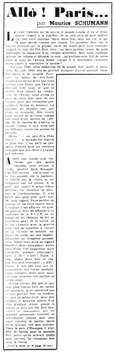 Étampes est, dans ma mémoire, coupée par un trou béant. Elle reprend a l'instant où je tiens moi-même l'appareil, et où j'entends la voix de Paris, calme, aiguë, maîtresse d'elle-même comme du destin, dicter ce message improvisé: “Allô! Allô! L'insurrection est déclenchée… Allô! Allô! Il paraît que les premiers journaux de la Résistance sont sortis au grand jour. Rappelez-moi tout à l'heure! Je vous donnerai confirmation… Allô! Allô! Division Leclerc, mettez les bouchées doubles! Arrivez vite, ou a besoin de vous!… Allô! Allô! Ici, gare d'Austerlitz. Voulez-vous prévenir l'état-major allié qu'il y a des chars “Tigres” devant la