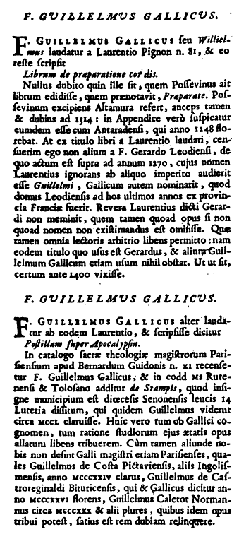 A tempore autem sancte memorie magistri lordanis usque ad annum domini M°CC°L°VIII° fuerunt de ordine fratrum predicatorum magistri licenciati a cancellario Parisiensi et actu et ordinarie legentes in sacra pagina Parisius fratribus et scolaribus: fratres Rotlandus Cremonensis, Hugo Viennensis, postmodum cardinalis; lohannes de sancto Egidio, Anglicus; Guerricus Flandrensis, Gaufridus de Blevello, Burgundus; Albertus Teutonicus, Laurencius Brito, Stephanus Altissiodorensis, Guillelmus de Stampis, Iohannes pungensasinum, Parisiensis; Bonus homo Britus, Helias Provincialis, Florencius Gallicus, Thomas de Aquino Apulus, Hugo Metensis, P(etrus) Tarantasiensis, Bartholomeus Turonensis, G(uillelmus) de Anthona, Anglicus; Baldoinus Gallicus; Enibaldus Romanus, postmodum titulo basilice .XII. apostolorum presbiter cardinalis. Hii omnes in domo sancti Iacobi ordinis predicatorum Parisius duo et duo legerunt et disputaverunt in scolis, presentibus scolaribus et religiosis et multis ecclesiarum prelatis, Deo et hominibus graciosi et multum fructum in docendo et in scribendo in Dei ecclesia facientes.