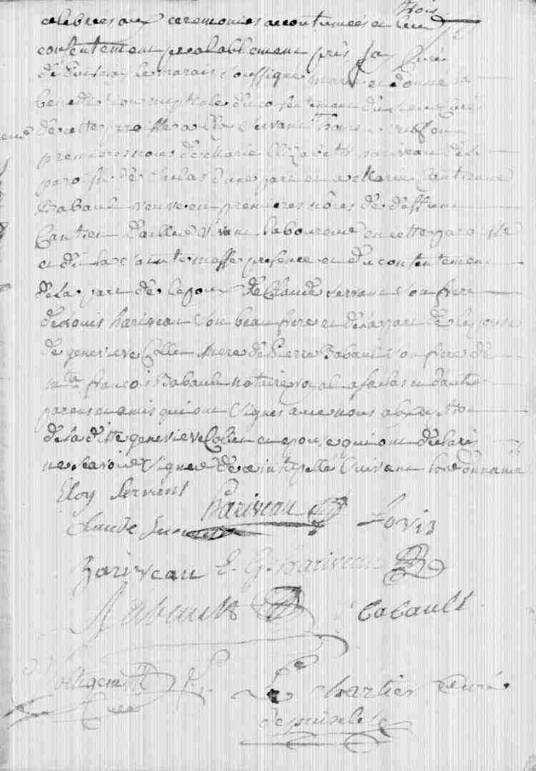 Transcription (par Patrice Brossard) — Aujourd'hui 25ème mai 1773 (25/05/1773) les publications des bans de futur mariage entre les parties ci après dénommée faites au prône des messes paroissiales le seize, vingt et vingt trois mai tant en cette paroisse qu'en celle de Saclas sur Vaux suivant le certificat du sieur curé de la dite paroisse, daté du vingt quatre du présent mois, signé Delavin, sans empêchement civil ou canonique à moi connu ainsi qu'au dit sieur curé, j'ai fiancé et célébrées aux cérémonies accoutumées et reçu leur consentement préalable, j'ai curé de Puiselet le Marais soussigné donné la bénédiction nuptiale * à Éloy Servant veuf en première noce de Marie Élisabeth Hariveau de la paroisse de Saclas d'une part et Cantienne Babeau veuve en premières noces de défunt Cantien Paillard vivant laboureur en cette paroisse et célébré la messe en présence et du consentement de la part de l'époux , de Claude Servant son frère, de Louis Hariveau son beau frère, de la part de l'épouse de Geneviève Collot sa mère, Pierre Babeau son frère de maître François Babeau notaire à Saclas et d'autres parents et amis qui ont signé avec nous, ladite Geneviève Collet de ce requis ont déclaré ne savoir signer de ce interpellés suivant l'ordonnance. [Signé:] Éloy Servant — Hariveau — Louis Hariveau — Babault — Voltigem — Chartier curé de Puiselet.
