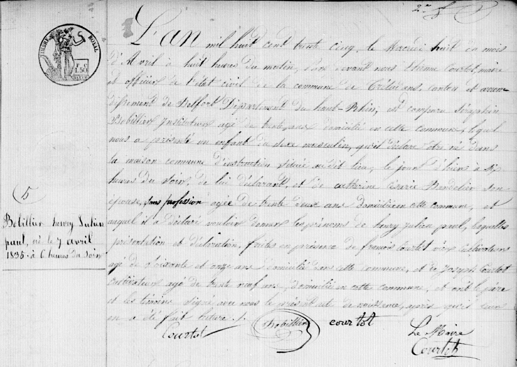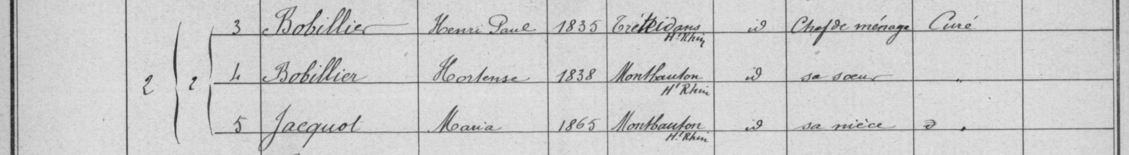 Henry-Julien-Paul Bobillier, né le 7 avril 1835 à Trétudans (territoire de Belfort), était le fils de Catherine-Césarie Bandelier (1802-1894) et de Pierre-François-Séraphin Bobilier (1804-1875), d'abord ouvrier sur métaux, ouvrier limeur, puis instituteur d'abord à Chévremont (…1831…) puis à Trétudans (…1833-1835…).