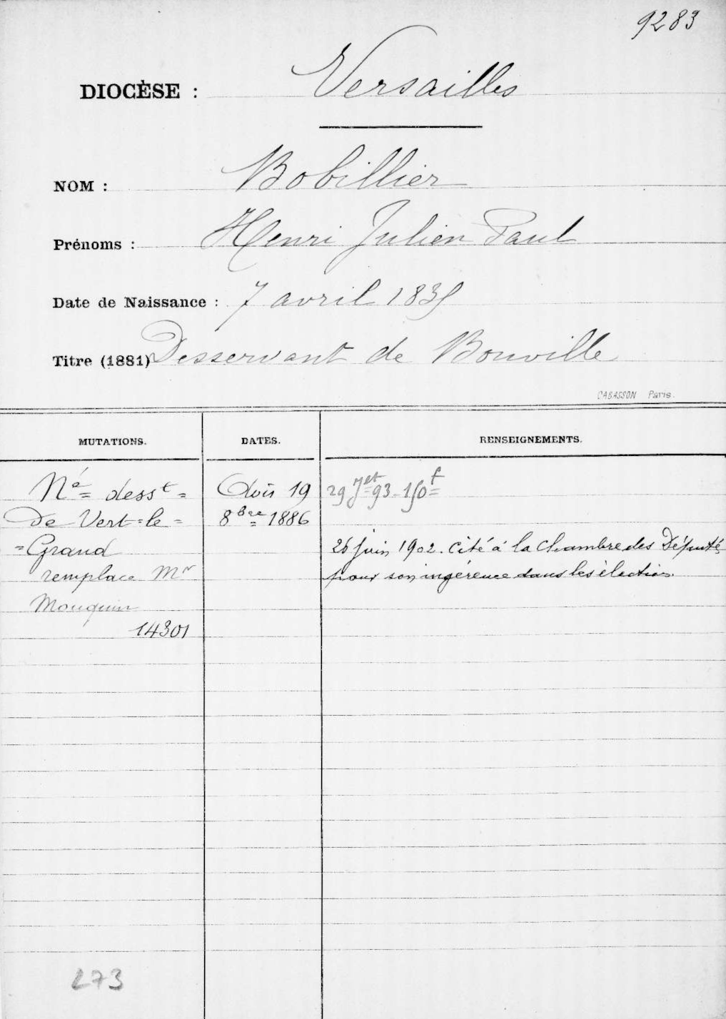 AN F/19/6693 (Fichier ministériel des ecclésiastiques du diocèse de Versailles).