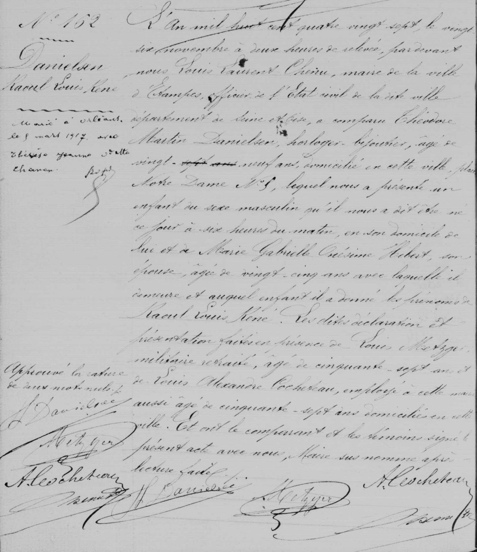 Il se maria à Étampes le 7 février 1882 avec Marie-Gabrielle-Onésime Hébert, née à Dreux (Eure-et-Loir) le 7 juin 1862, fille de Léontine-Éléonore-Céline Aubé et de son époux Jules-Léon Hébert, horloger-bijoutier à Étampes, 4 place Notre-Dame.
