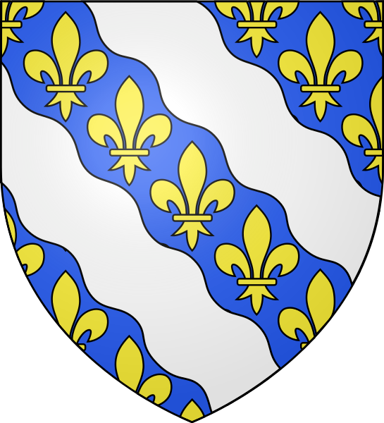 Blasonnement. — D'azur semé de fleurs de lys d'or aux deux bandes ondées d'argent brochant sur le tout. En anglais: Azure semy de lis or two bends wavy argent overall.