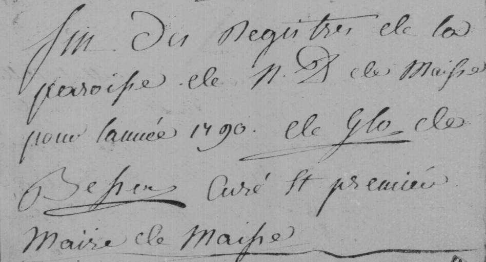- La cure de Notre-Dame de Maisse était vacante depuis la disparition du curé Dehauport qui signe le registre pour la dernière fois le 23 décembre 1777, remplacé après cela par le curé de la paroisse voisine de Saint-Médard de Maisse, Hutteau, qui signe comme “desservant” à partir du 13 janvier 1778 et jusqu'au 16 décembre 1784. Glo de Besse ne signe qu'à partir du 18 mars 1785.