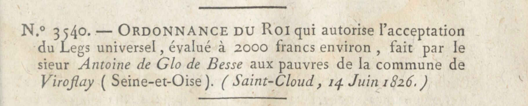 - N.° 3540. — Ordonnance du roi qui autorise l'acceptation du Legs universel, évalué à 2000 francs environ, fait par le sieur Antoine de Glo de Besse aux pauvres de la commune de Viroflay (Seine-et-Oise). (Saint-Cloud, 14 Juin 1826.)