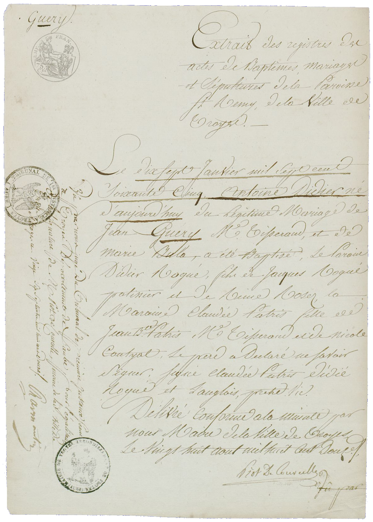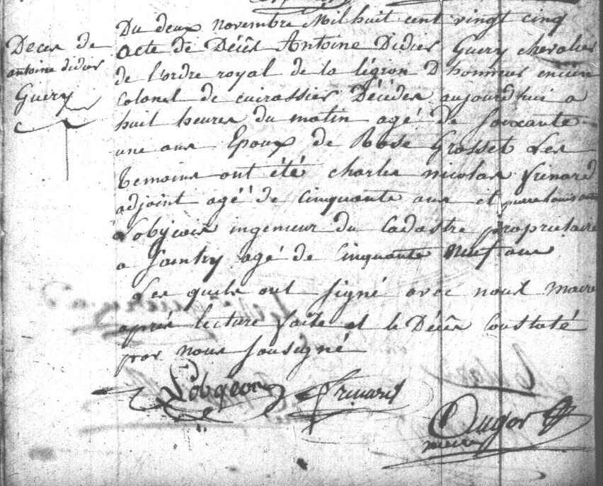 - Antoine-Didier Guéry, né le 17 janvier 1765 à Troyes (Aube) et baptisé le même jour paroisse Saint-Rémi, était le fils du maître tisserand Jean Guéry et de son épouse Bula.