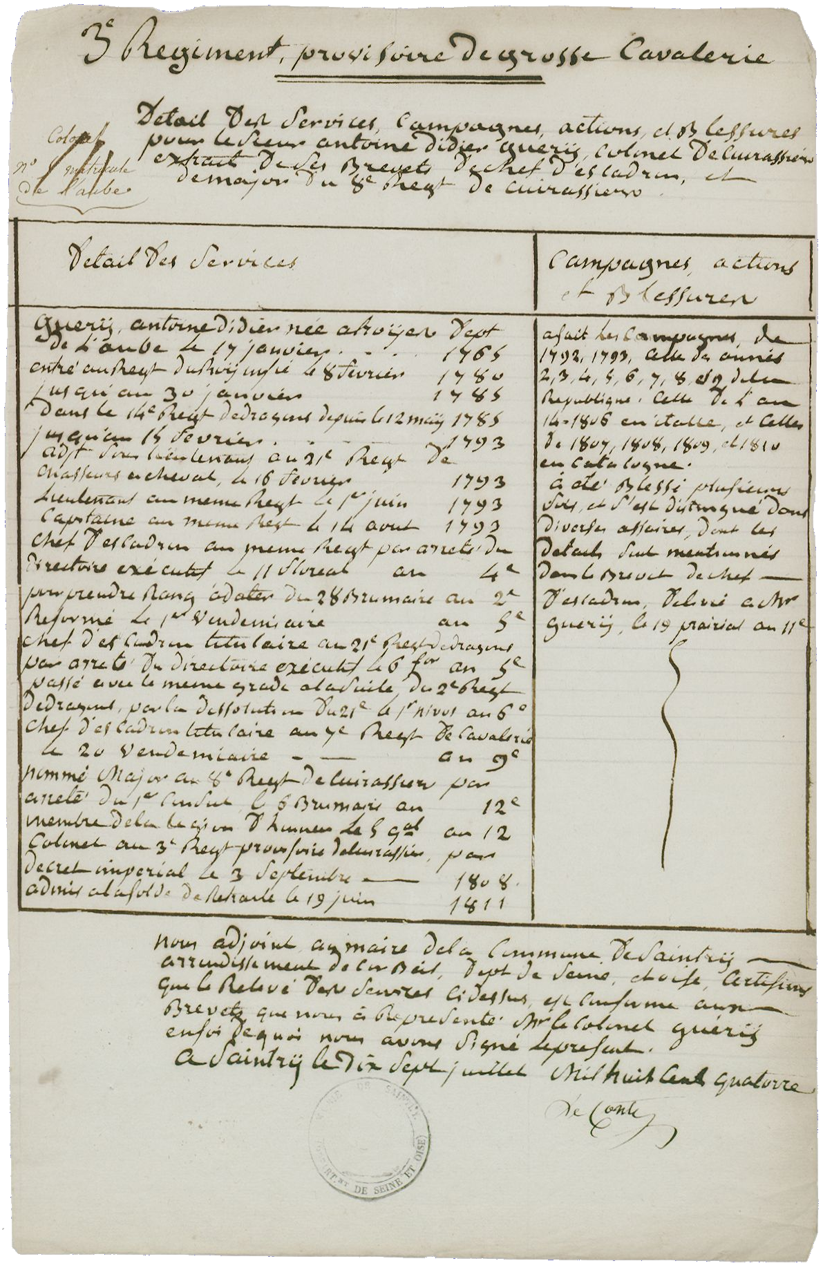 - 6° un état de services certifié le 17 juillet 1814 à Saintry par Lecomte, adjoint au maire.