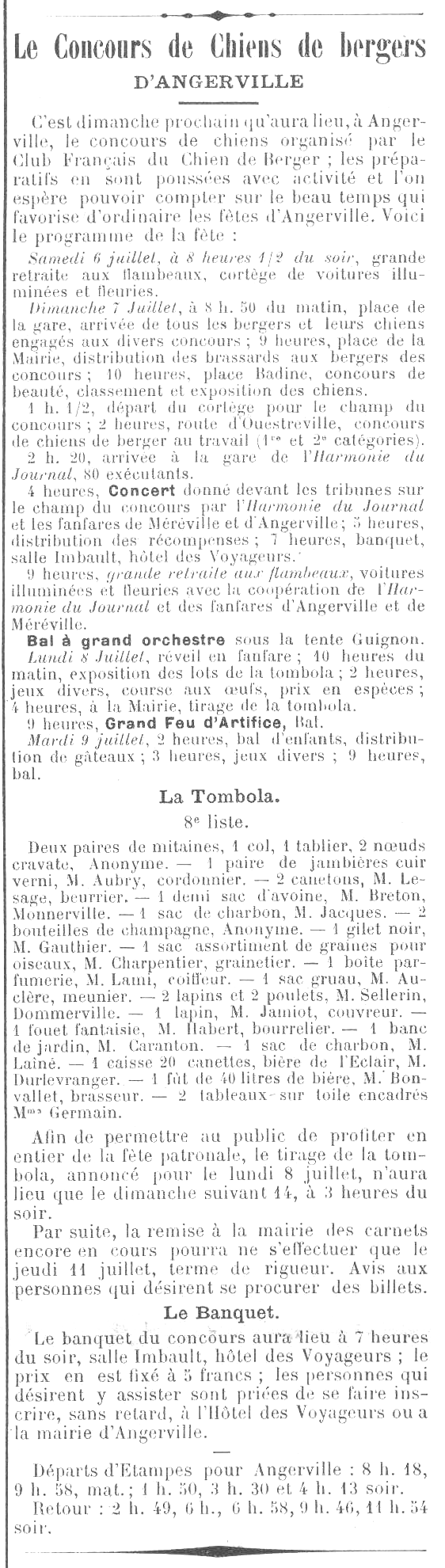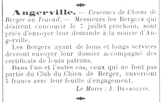 - Anonyme, “Le concours de chiens d'Angerville”, L'Abeille d'Étampes 96/17 (18 avril 1907) 2, 96/18 (25 avril 1907) 2, 96/19 (4 mai 1907) 2, 96/20 (18 mai 1907) 2, 96/21 (25 mai 1907) 2, 96/22 (1er juin 1907) 2, 96/23 (8 juin 1907) 2, 96/24 (15 juin 197) 2, 96/25 (22 juin 1907) 2, 96/26 (29 juin) 2, 96/27 (6 juillet) 2, 96/28 (13 juillet 1907) 1-3 et 96/28 (20 juillet 1907) 2.