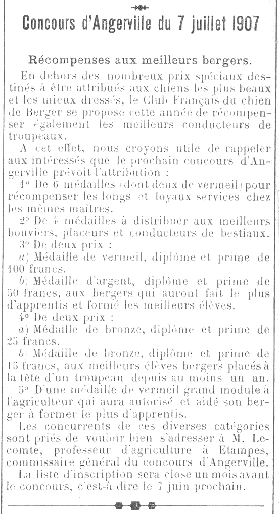 - Anonyme, “Concours de chiens de berger à Angerville”, Le Sport universel illustré. Revue hebdomadaire de tous les sports et de l'élevage 571 (21 juillet 1907) 485 et 494-496 (avec 12 bons clichés).