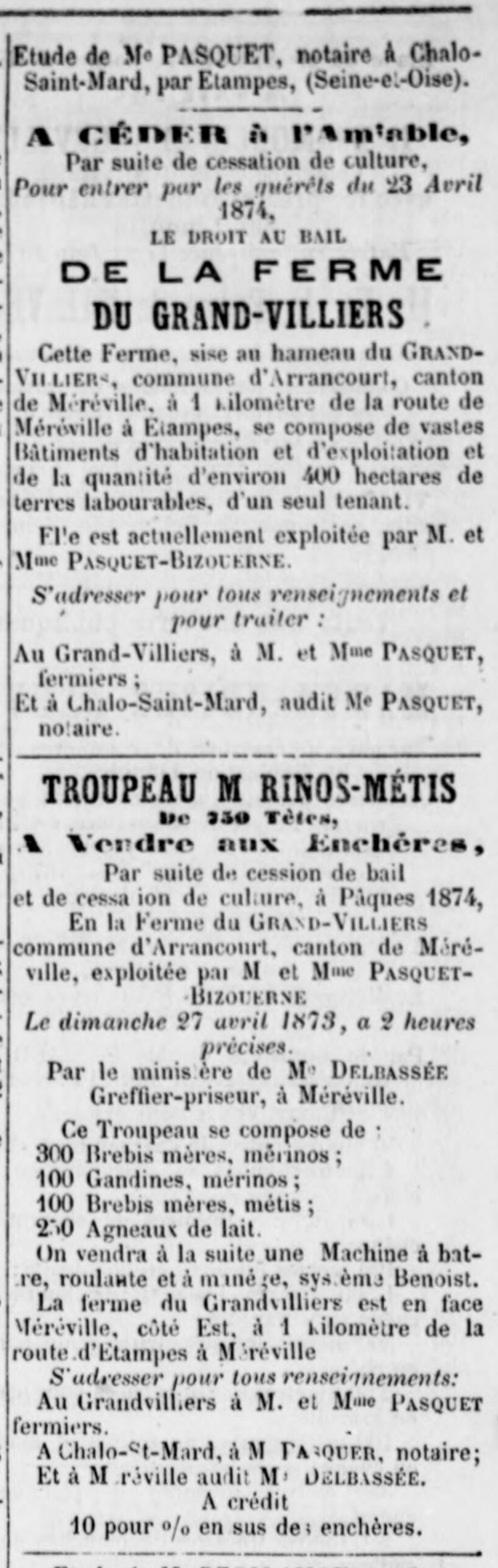 - Vente de la ferme du Grand-Villiers en 1873 — Le Courrier du Loiret du 13 avril.