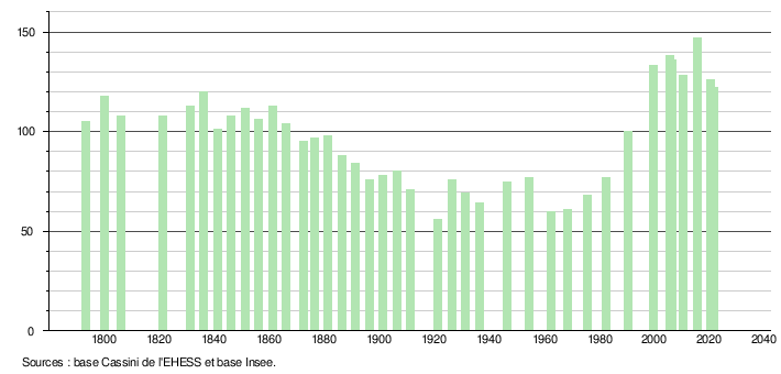 Sur la base de données empruntées, pour les années 1793-1999, au site du Laboratoire de Démographie et d'Histoire Sociale de l'EHESS, École des hautes études en sciences sociales; et, pour les années 2006 à 2021, au site de l'INSEE, Institut national de la statistique et des études économiques.