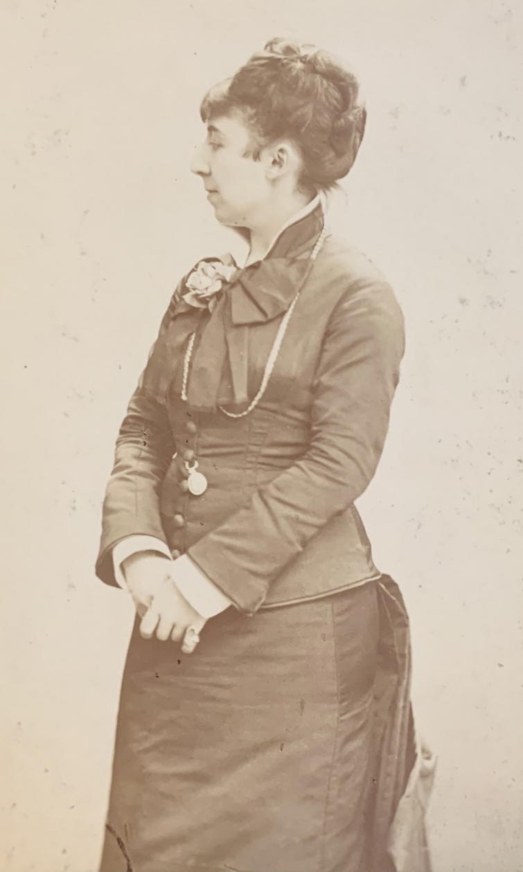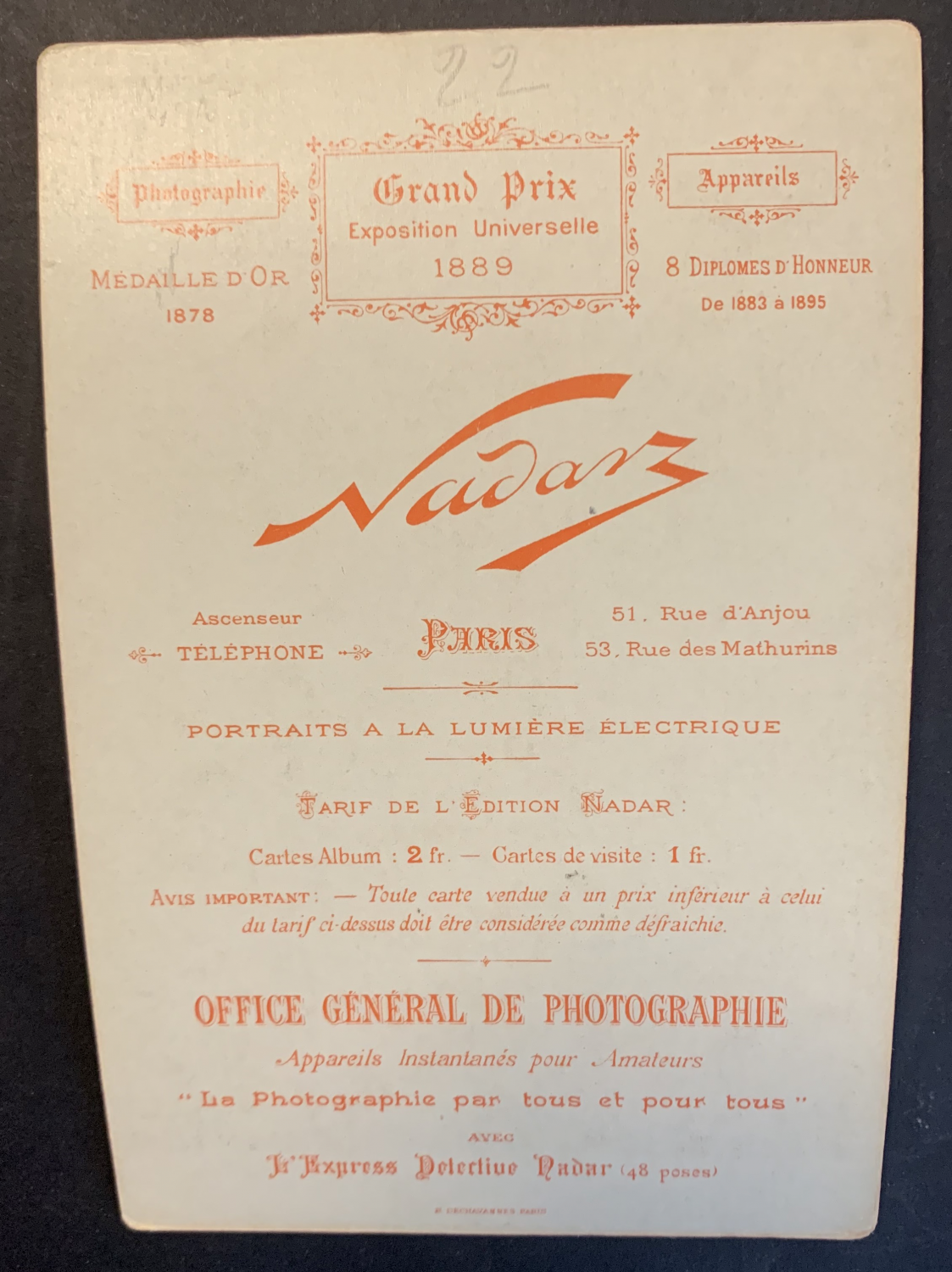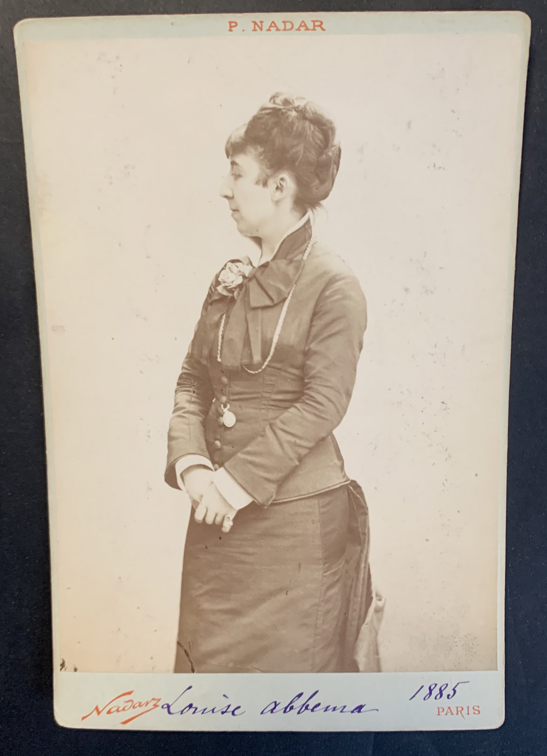 - Ce portrait photographique de Louise Abbéma en plan 3/4, le visage de profil gauche, est édité par Paul Nadar, c'est-à-dire par Nadar fils. Un exemplaire en était en vente en février 2023 sur le site d'enchères en ligne eBay avec une mise à prix de 100 €. Le vendeur le présente comme provenant “d'une collection exceptionnelle d'artistes de la fin du XIX°siècle”. L'exemplaire en question, développé en sépia sur une carte de 16,5 de haut sur 10,5 de large, est titré manuellement à l'encre bleu: Louis Abbéma, 1885. Si cette date est exacte, il s'agit, d'après les inscription portées au verso, d'un retirage postérieur à 1895. On reproduit ici les clichés de cette carte mis en ligne par le vendeur.